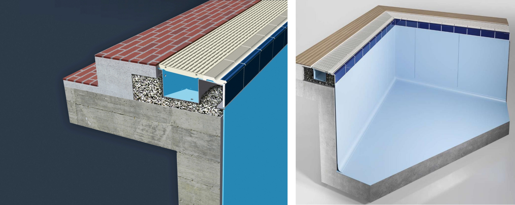 По аналогии с классической технологией, дно бассейна представляет собой бетонную плиту, гидроизолированную при помощи гладкой запатентованной ПВХ-мембраны.